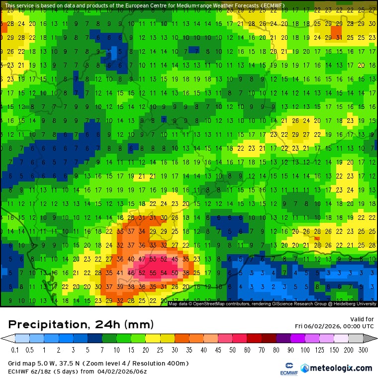 Para mañana jueves esperamos la llegada de un nuevo frente frío con precipitaciones débiles a moderadas que afectarán de forma generalizada a la provincia de Málaga y con algo de más intensidad a las comarcas más occidentales de la provincia como Ronda o Sol occidental. El viento soplará con mucha fuerza en toda la provincia haciendo que tengamos rachas de viento muy fuertes de componente oeste – suroeste superando los 80 e incluso los 90 km/h. Precaución con las crecidas de ríos y arroyos debido a la cantidad de agua que se seguirá acumulando y a las tierras saturadas. Se esperan mas de 50 litros en zonas de la Serranía de Ronda o el Valle del Genal que será la zona mas crítica de la jornada. El Bajo Guadalhorce y el Área Metropolitana de Málaga será la zona donde menos llueva debido al efecto foehn. Temperaturas sin cambios. Máximas de 20ºC – 21ºC en la costa con mínimas que podrían bajar hasta los 16ºC, mientras que en las comarcas de Ronda y Antequera las máximas rondarán los 15ºC – 16ºC con mínimas que pueden bajar hasta los 8ºC.