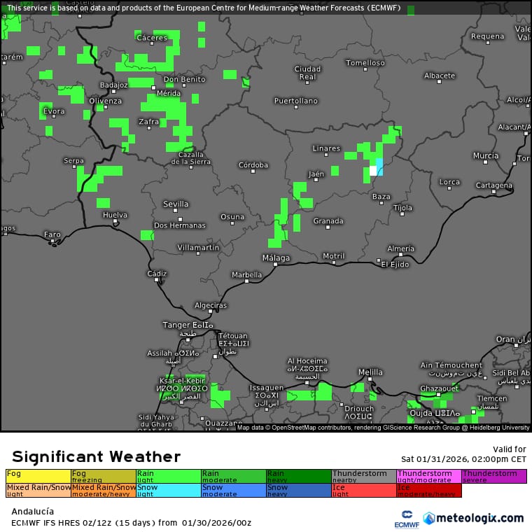 El mes de enero se despedirá en la provincia de Málaga con un día de tregua tras las ultimas lluvias que hemos tenido con cielos despejados y un día de estabilidad atmosférica que durará poco ya que para el domingo llegan nuevas lluvias. Los cielos se mostrarán poco nubosos o con alguna nube alta y mucho sol. El viento soplará del noroeste (terral) con algunas rachas moderadas o puntualmente fuertes por encima de los 50 o 60 km/h. Precaución con el fuerte viento. Las temperaturas no tendrán apenas cambios. Temperaturas primaverales. Las máximas pueden rondar los 18ºC – 19ºC en la costa con mínimas que podrían bajar hasta los 13ºC, mientras que en las comarcas de Ronda y Antequera las máximas rondarán los 15ºC – 16ºC y las mínimas pueden bajar hasta los 8ºC.