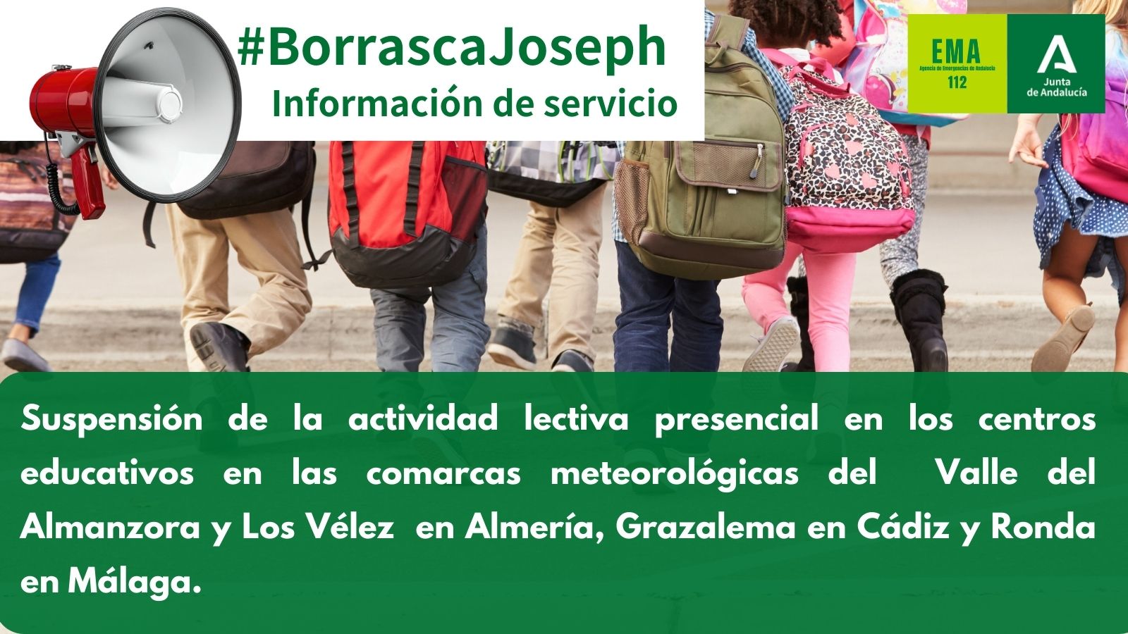 La situación meteorológica motiva SUPENSIÓN de actividad lectiva presencial en centros educativos y asistenciales en 77 municipios de comarcas meteorológicas de:
