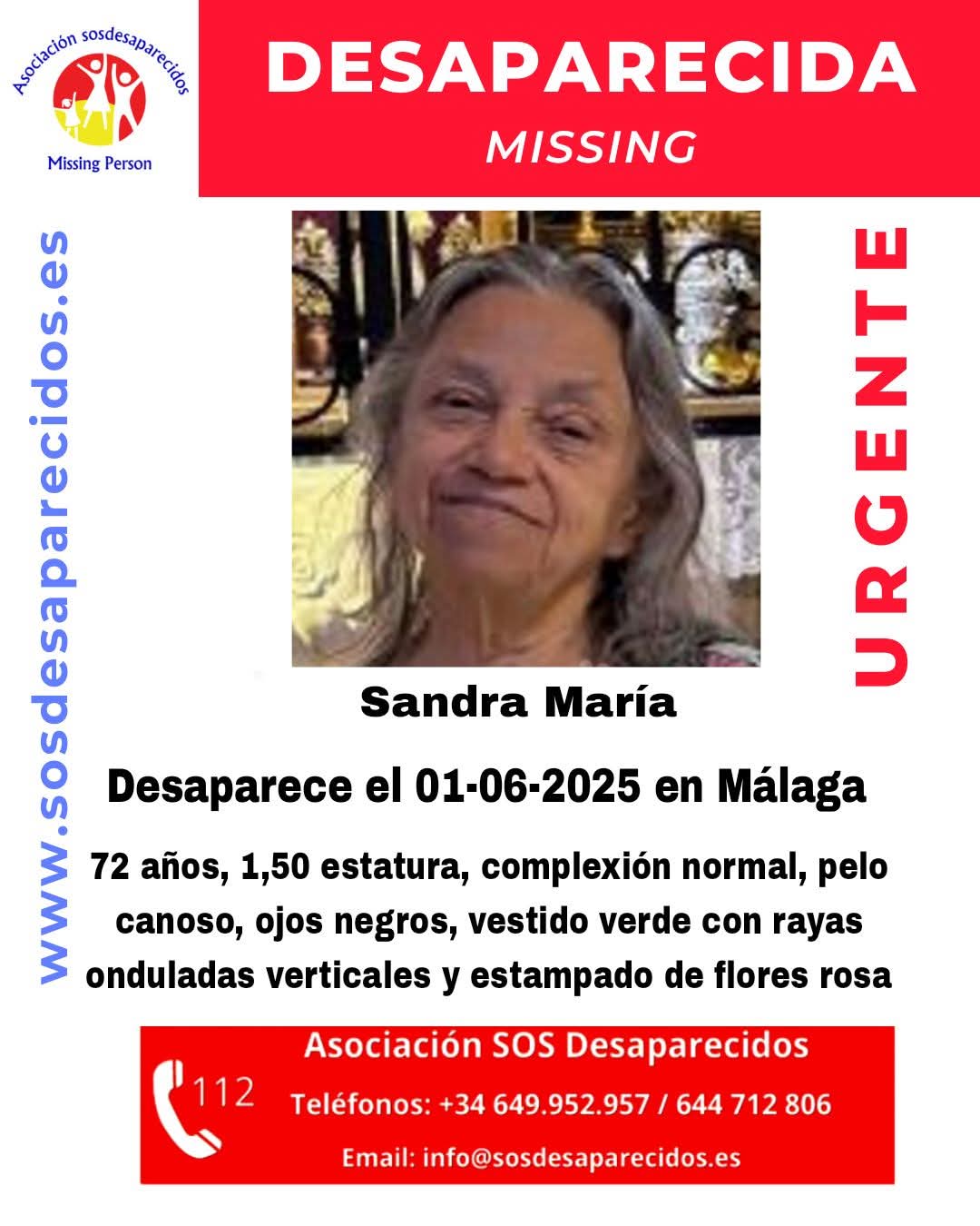 Una vez más pedimos la.colablracion ciudadana para tratar de localizar a Sandra María de 72 años de edad y desaparecida desde el pasado día 1 de Junio en Málaga