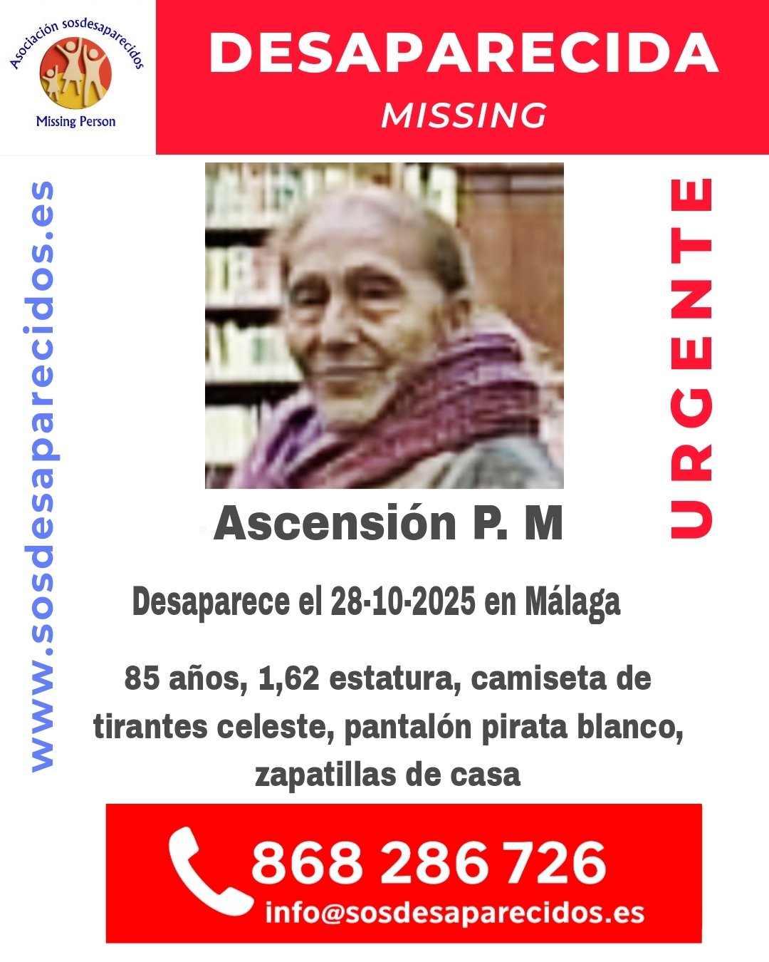 Pedimos una vez más la colaboraciones ciudadana para tratar de localizar a Ascensión, de 85 años y desaparecida en Málaga.